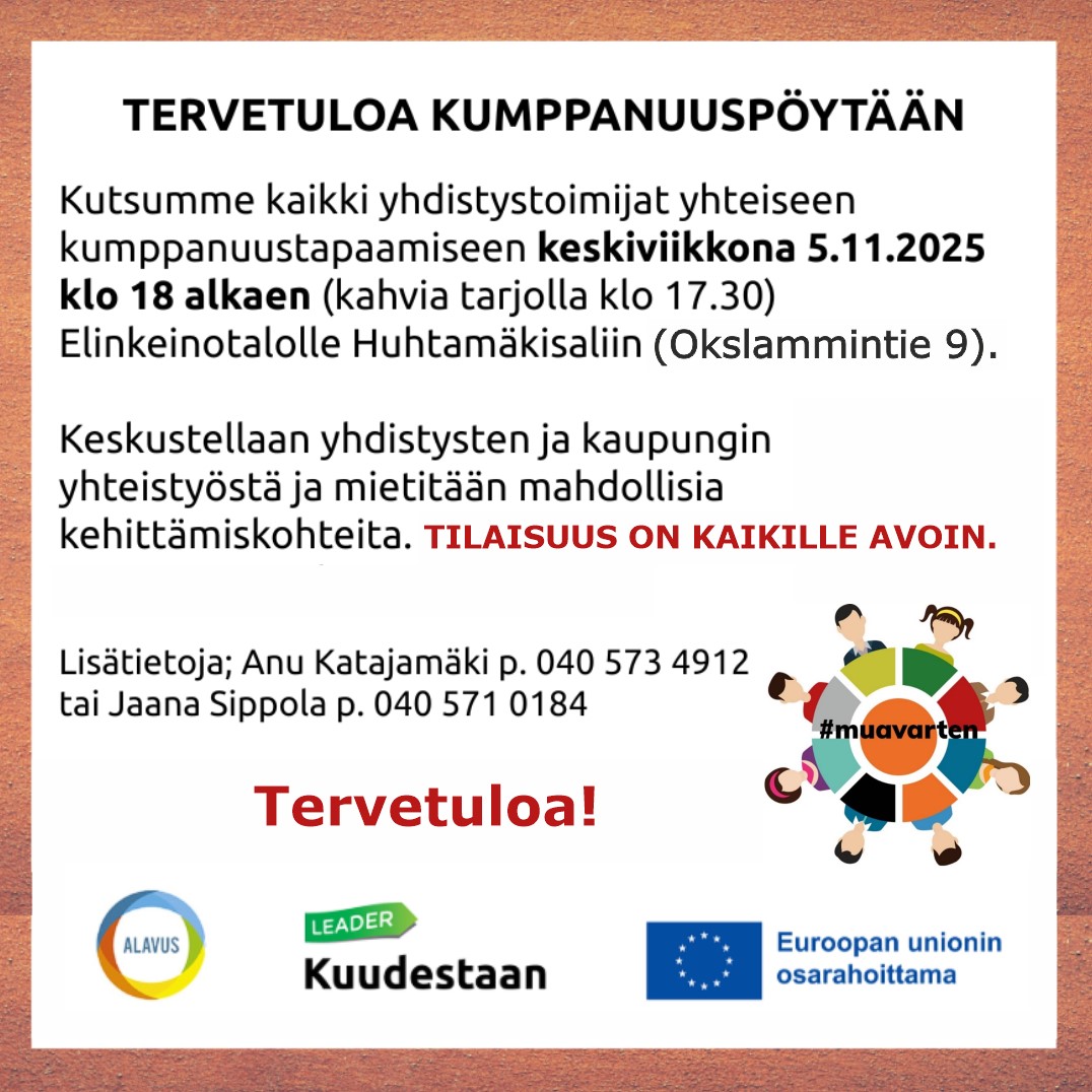 Kutsumme kaikki yhdistystoimijat yhteiseen kumppanuustapaamiseen keskiviikkona 5.11.2025 klo 18 alkaen Alavuden Elinkeinotalolle Huhtamäki-saliin (Okslammintie 9).