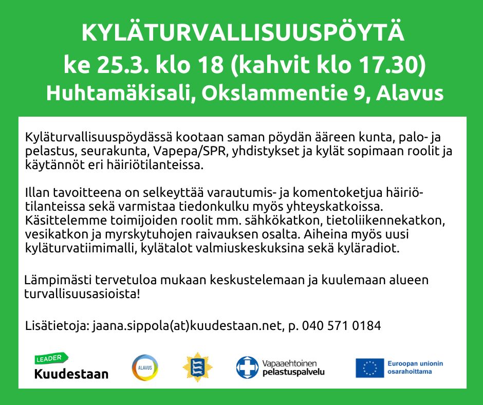 Alavuden Kyläturvallisuuspöytä ke 25.3. klo 18 (kahvit klo 17.30)