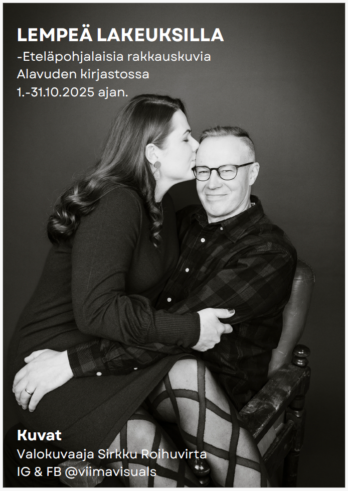 Lempeä lakeuksilla - Eteläpohjalaisia rakkauskuvia on valokuvaaja Sirkku Roihuvirran valokuvanäyttely, ja se on esillä Alavuden kirjastossa 1.10.2025 - 31.10.2025.