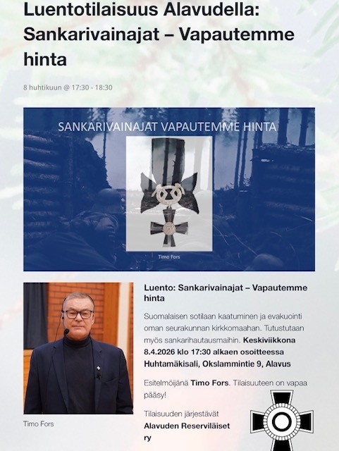 "Sankarivainajat, vapautemme hinta" - Timo Forsin luento ke 8.4. Huhtamäki-salissa klo 17.30 alk.