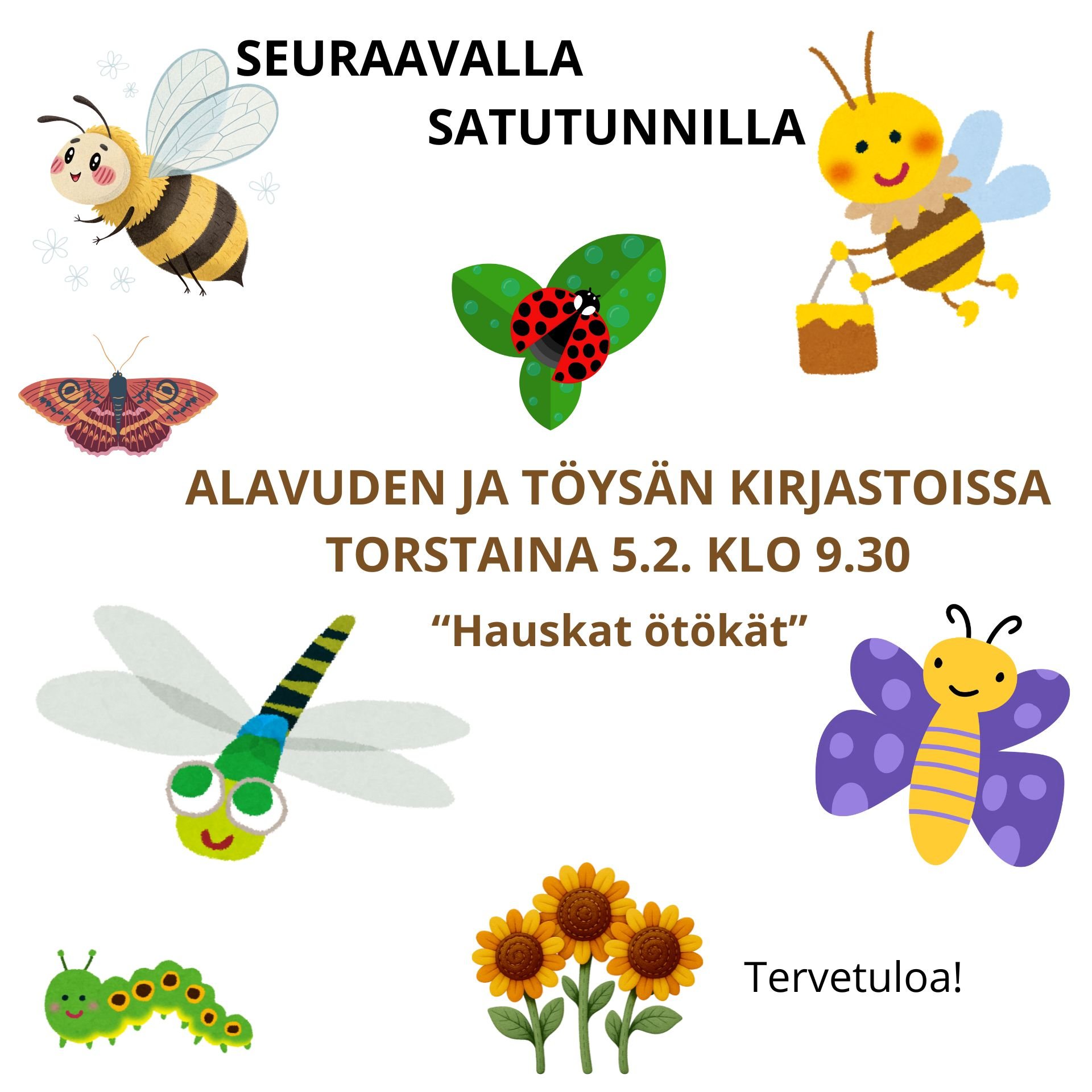 Tervetuloa satutunnille Töysän kirjastoon to 5.2. klo 9.30. Aiheena "Hauskat ötökät."