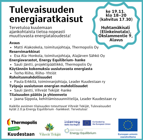 Paikallisista energiaratkaisuista tulee kertomaan Riiho-yhtiöistä Terho Riiho ja reservimarkkinoista kertoo Alajärven Sähkön toimitusjohtaja Esa Ala-Honkola. Lisäksi paljon muuta.