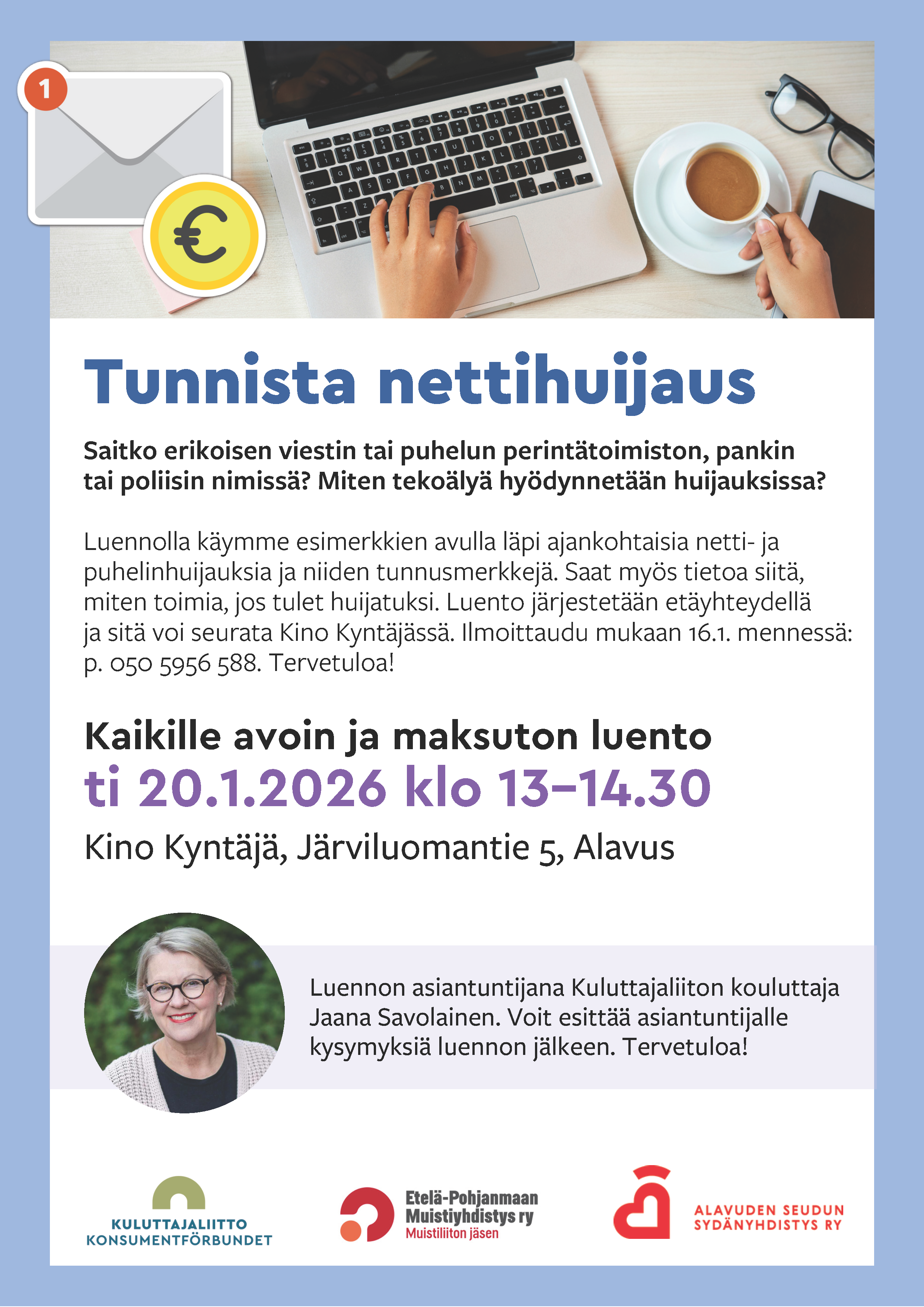 Tunnista nettihuijaus -luento, etäkatsomo ti 20.1. Kino Kyntäjässä klo 13.00-14.30