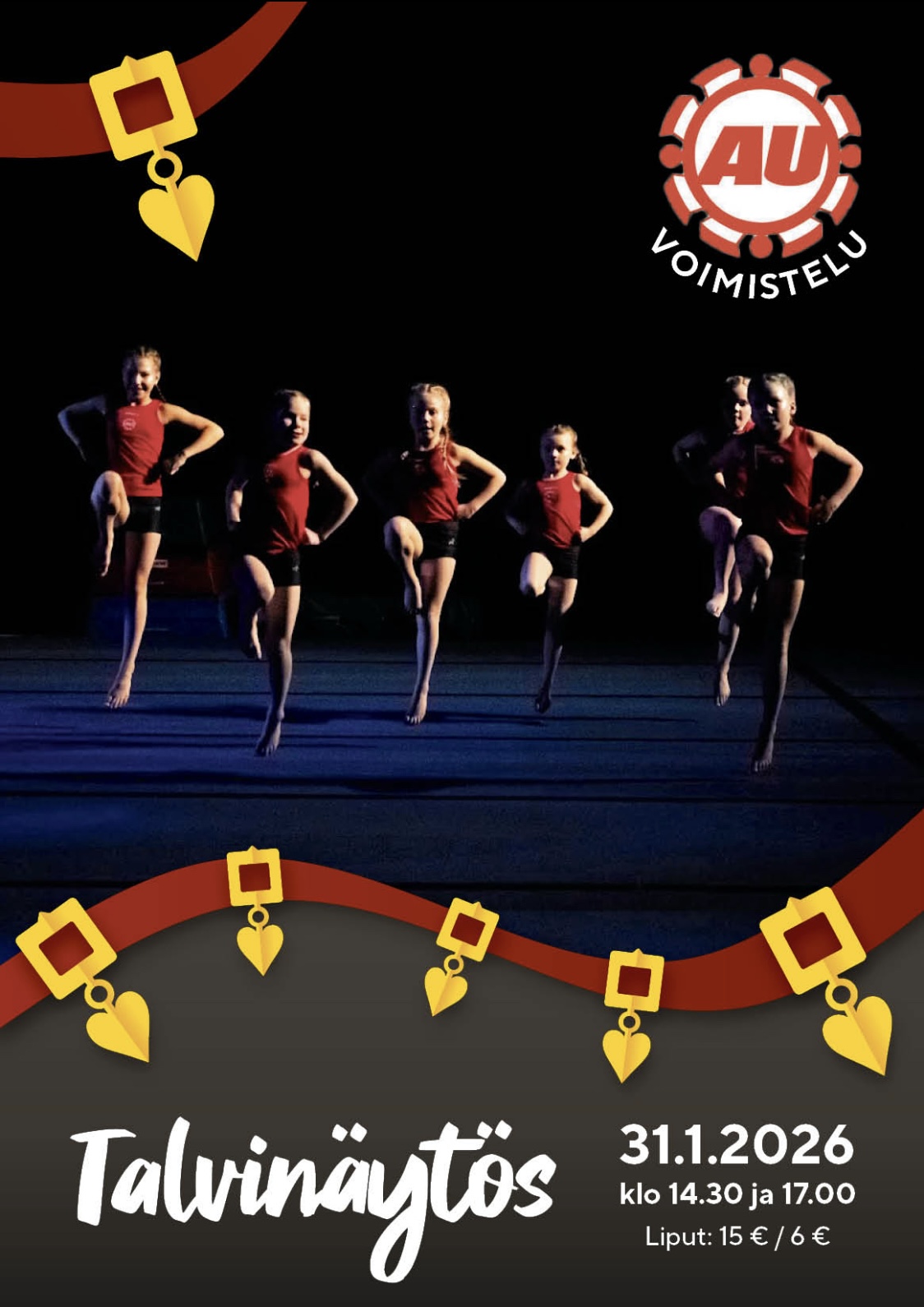 Alavuden Urheilijoiden voimistelijat järjestävät talvinäytöksen Kunto-Lutrassa lauantaina 31.1.2026 klo 14.30 ja klo 17.00.