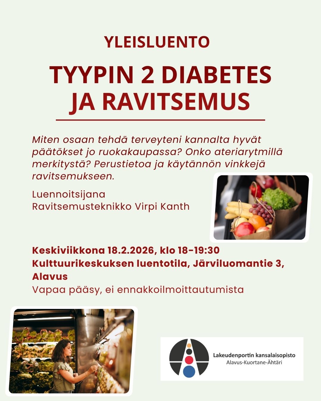 Yleisluento: Tyypin 2 diabetes ja ravitsemus ke 18.2. Kulttuurikeskuksen luentotilassa klo 18.00-19.30