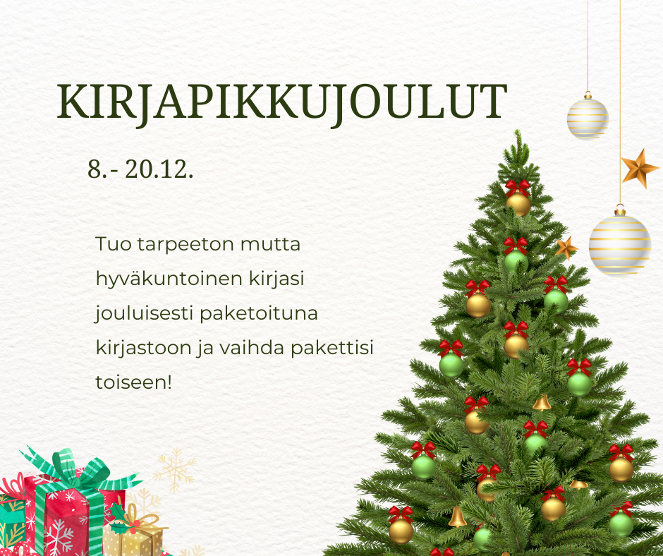 Tuo tarpeeton mutta hyväkuntoinen kirjasi jouluisesti paketoituna Alavuden pääkirjastoon ja vaihda pakettisi toiseen!