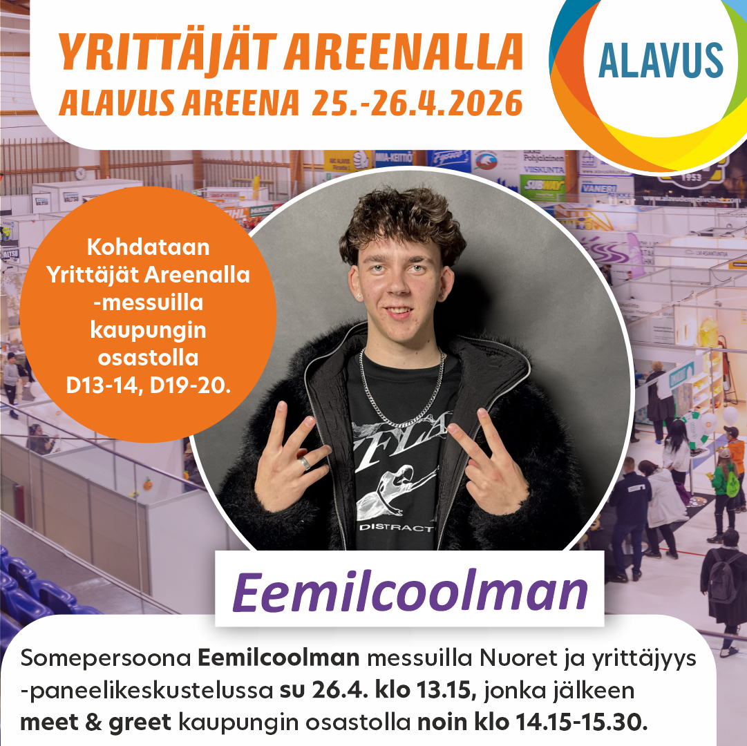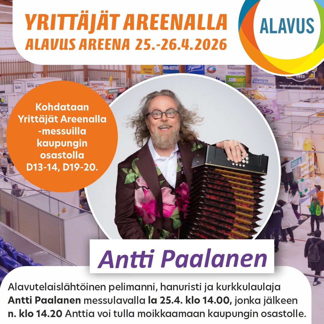 Alavuden kaupunki on mukana myös Yrittäjät Areenalla -messuilla Alavus Areenalla 25.-26.4.2026 omalla osastolla D13-14, D19-20.