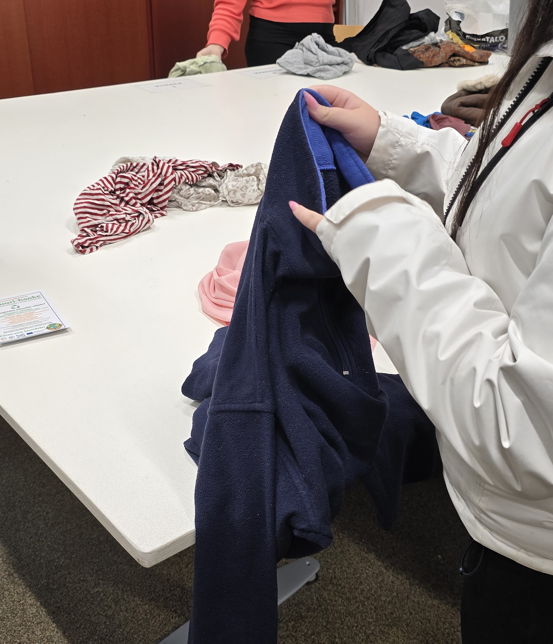 Tekstiilien lajittelupisteellä nuoret opettelivat tunnistamaan eri kangaslaatuja ja Textuuri-hankkeen vastaava ohjaaja Marianne Mäkelä kertoi pikamuodista ja sen ympäristövaikutuksista.